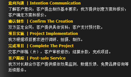 意向溝通 | Intention Communication 十年磨一劍,經(jīng)典影視已經(jīng)成為業(yè)內(nèi)規(guī)模化品牌傳播專業(yè)機構(gòu)。   思想力——Idea Create Value! 品牌傳播相信:只有與眾不同的創(chuàng)意,才能為客戶創(chuàng)造價值!出色的藝術(shù)是創(chuàng)意品牌的保證;我們是客戶的伙伴,我們并肩作戰(zhàn),只為創(chuàng)造一個偉大的品牌。   智慧力——創(chuàng)作團隊 創(chuàng)意總監(jiān)——創(chuàng)意來自生活,高于生活 美術(shù)指導(dǎo)——身手敏捷,思想敏銳,具有獨特的美術(shù)嗅覺 資深策劃——思維縝密而又膽識過人,常常給人意外之喜 經(jīng)典影視.品牌傳播,采用國際化的Team作業(yè)模式——   保證力——作業(yè)流程 我們一直相信,只有科學(xué)、規(guī)范的作業(yè)流程作為運作保障,優(yōu)秀的創(chuàng)意才能得以完美的實施。在經(jīng)典影視,我們一直秉承——策略精準(zhǔn) . 創(chuàng)意新銳 . 執(zhí)行出色。